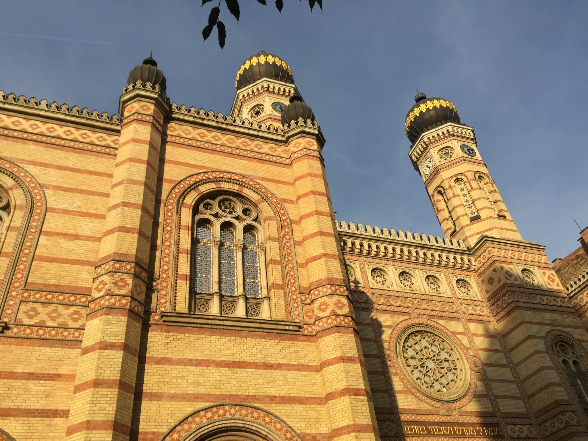 There is a bathtub split in half that is a seating area. So many rooms and odd things turned into seating areas. It’s a bar so I need a drink. It says cash only and I didn’t get any Hungarian forint(HUF). I offer euros and the bartender changes 5 Euros into 1350 HUF and gives me a big glass of Hungarian wine and 1000 HUF back. So the wine is less than 2 euros! The bartender tells me that Szimpla invites local artists to come decorate, so it is a hodgepodge of mismatched decor. I grab a seat. A fellow next to me, Steve, and I start to chat. He is an interesting British guy living in Thailand. Travels all the time. Just came to Budapest for a couple of nights. Recently was in 9 countries in South America. I thought I loved to travel! We had a really good discussion of pros and cons of traveling solo. We agreed the best part is not owing any apologizes when you make a mistake. Like getting on the train going the wrong way and realizing it 2 stops later. You simply get off and go back the other way. This neighborhood area is really cool. I wander around a little and do a little shopping. I turn the corner and there is the Great Synagogue. The second biggest Syngogue in the world. Quite lovely in this light.